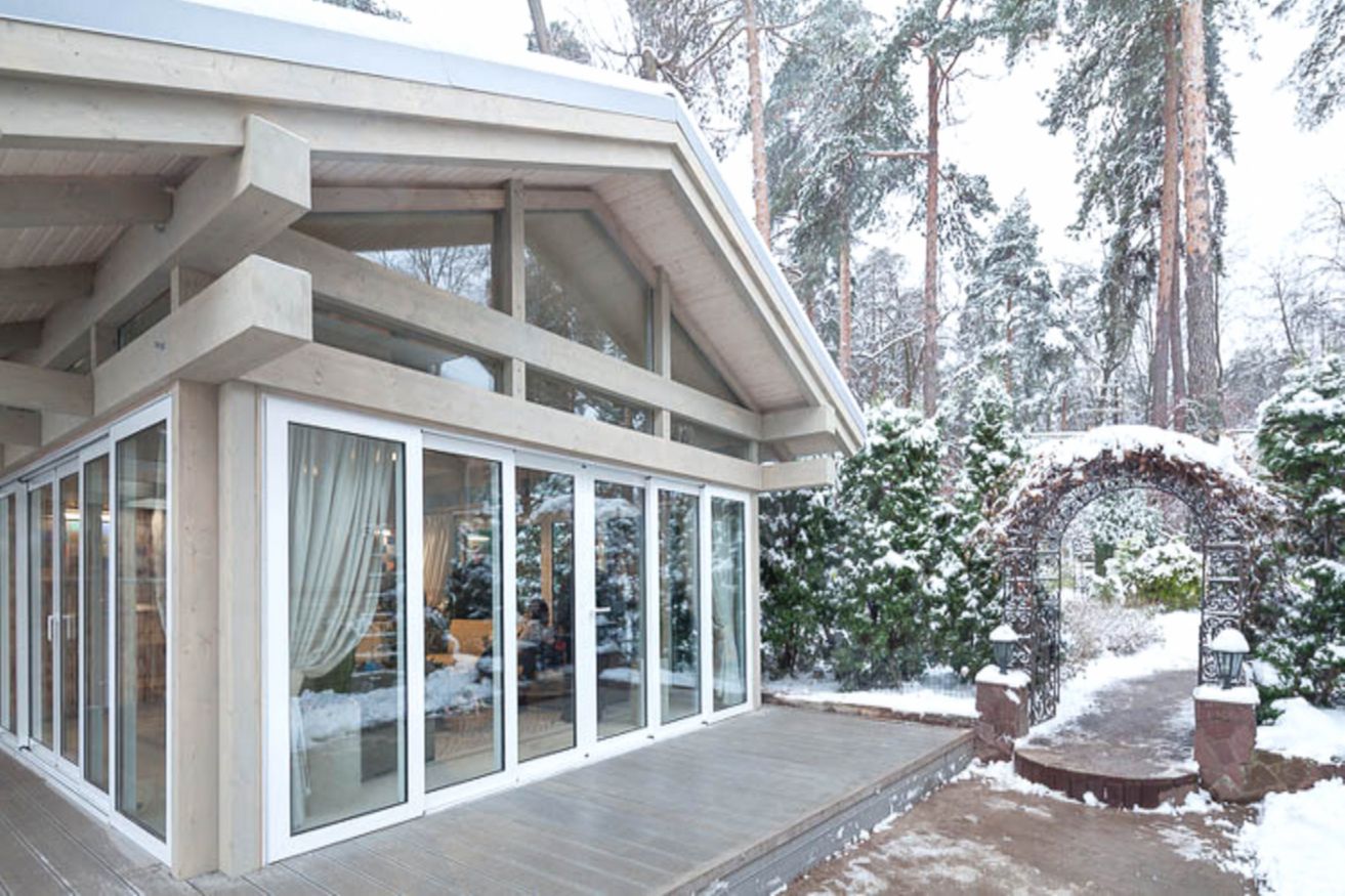 Снаружи всё выглядит почти как дворянская усадьба: экзотические растения, кованые арки, мощёные дорожки, аккуратно разделяющие участок. Настоящая загородная классика с налётом аристократизма.