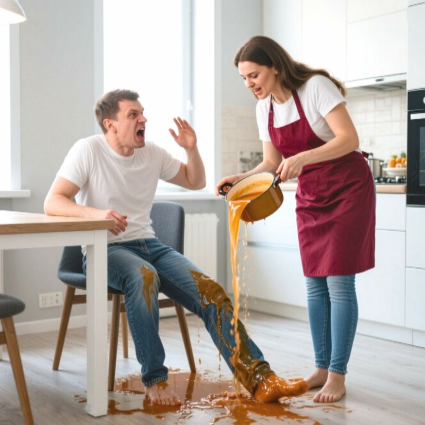 Он почуял неладное, попытался отодвинуться, но было поздно. Света опрокинула кастрюлю, и густой гороховый суп полился вниз — прямо на колени Игоря, на джинсы, на пол, на стол.