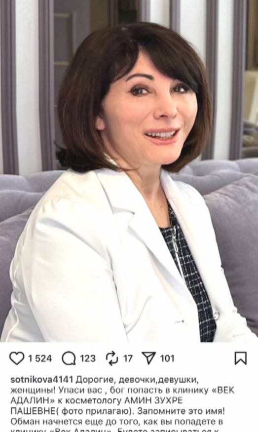 «Пишу это и понимаю: если не я, вам неоткуда будет взять честную информацию. Негативные отзывы на сайте клиники блокируются! Сообщаю это, чтобы уберечь ваши лица и деньги. Всем здоровья и красоты. Будьте бдительны и счастливы!» — заключила звезда.