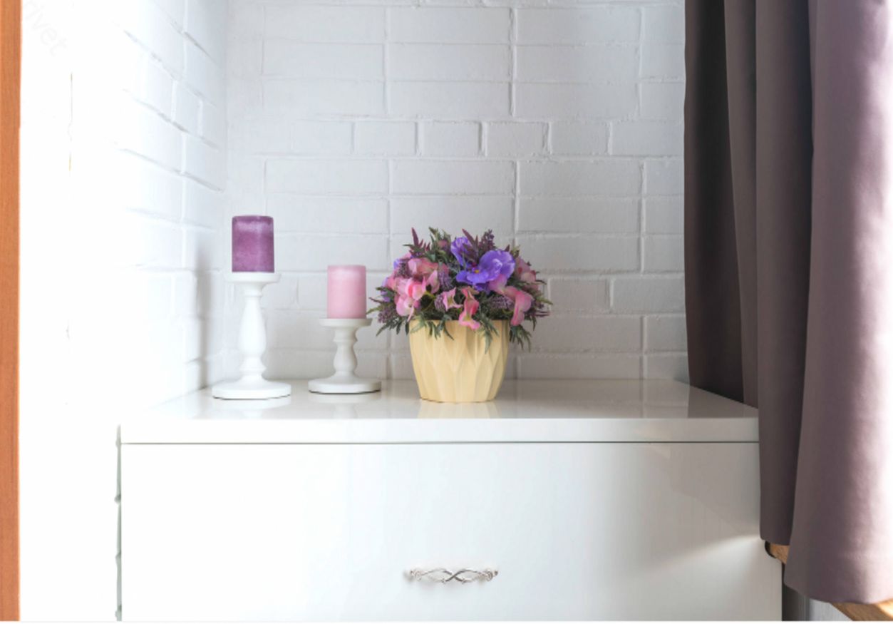Например, шторы в её любимом сиреневом цвете были изготовлены из благородного дамаска, а декоративные подушки сшиты вручную из греческих материалов.