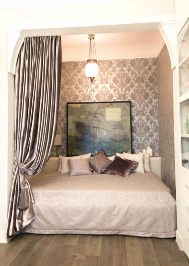 Одна часть отведена под приём гостей, другая — для личного уединения. Кровать установили в нише, которую можно закрыть плотными шторами. Это позволяет хозяйке спокойно отдыхать в любое время суток, не отвлекаясь на дневной свет.