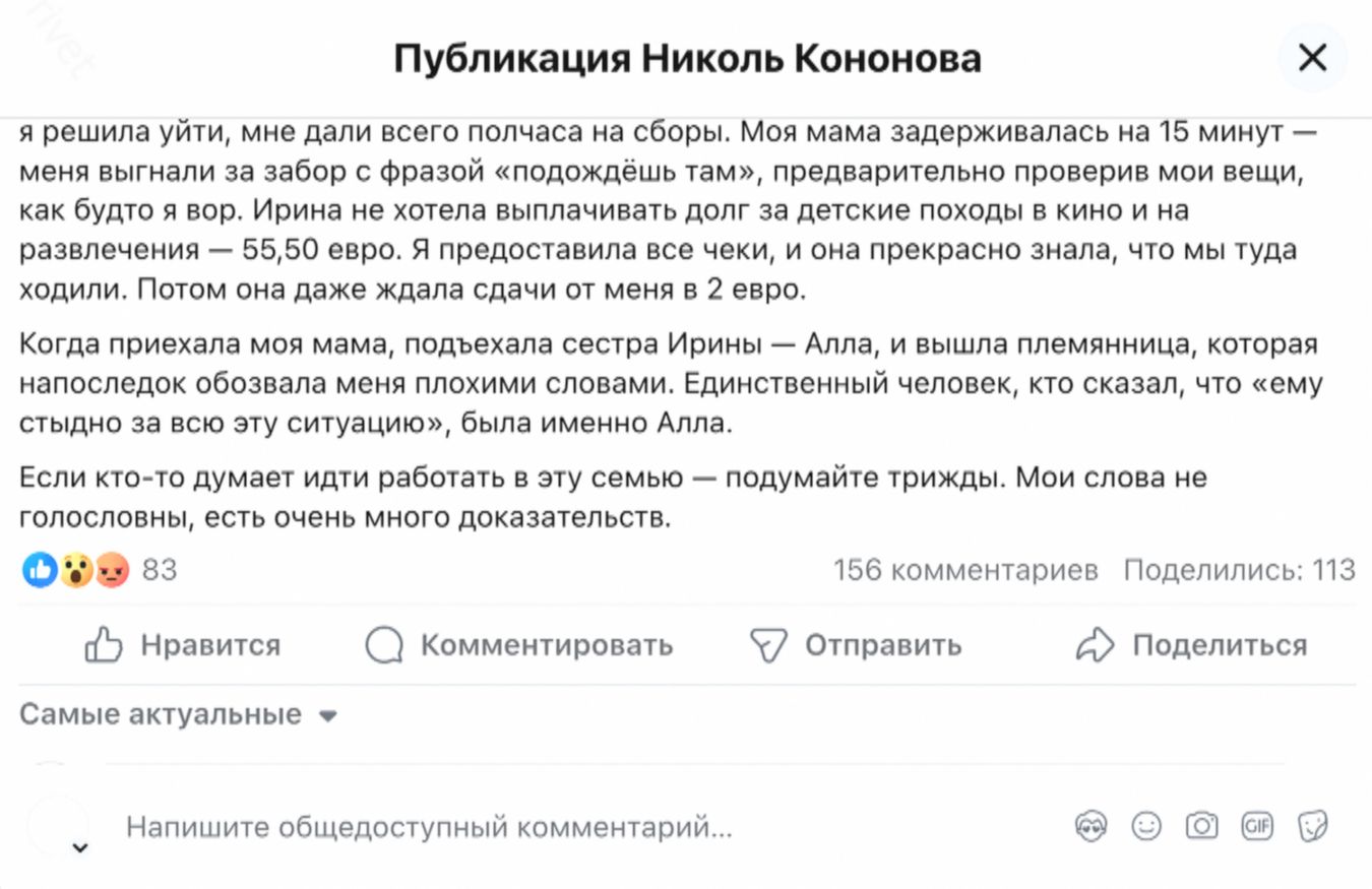 Между тем, сама Николь Кононова не стала скрывать отношение хозяев к наемной работнице. По ее словам, она уволилась, не выдержав атмосферы.