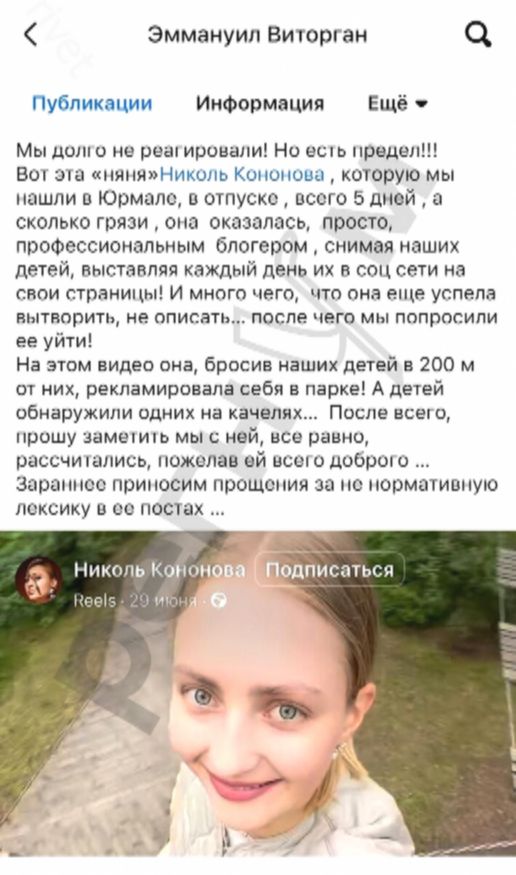 Самое время вспомнить скандал с прошлой няней, Николь Кононовой. По словам Виторгана, они нашли ее в Юрмале, где проживают по полгода, а девушка оказалась блогером, выкладывала фото детей в своих соцсетях.
