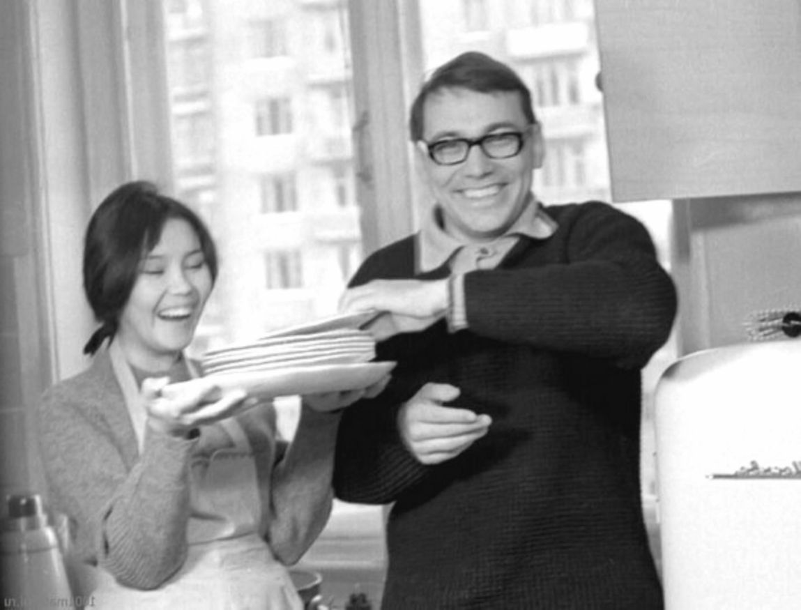 «Он после съёмок говорил: «Я приеду вечером поужинать, а ты ко мне спустишься и посидишь со мной». Я спускалась, садилась. Он ел (а поесть он очень любил), а мне он брал блюдечко нашинкованной капусты. Без соли, без масла. Я как заяц, сидела эту капусту грызла, и больше мне ничего не полагалось. Потому что у меня были такие пухленькие щёки, а ему хотелось, чтобы они были впалые», — вспоминает Аринбасарова.