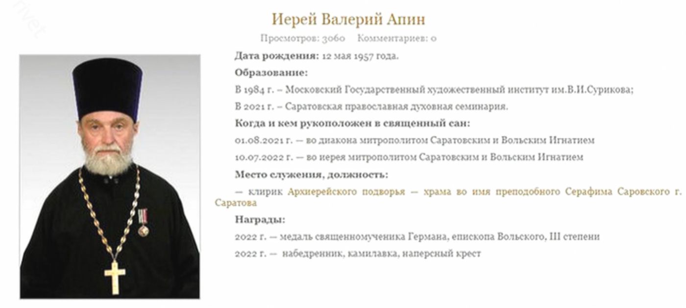 Валерий Апин после окончания Саратовской православной духовной семинарии служит клириком в местном храме. У него даже есть медаль священномученика Германа, епископа Вольского, III степени. Однако экс-супруги давно не общаются.