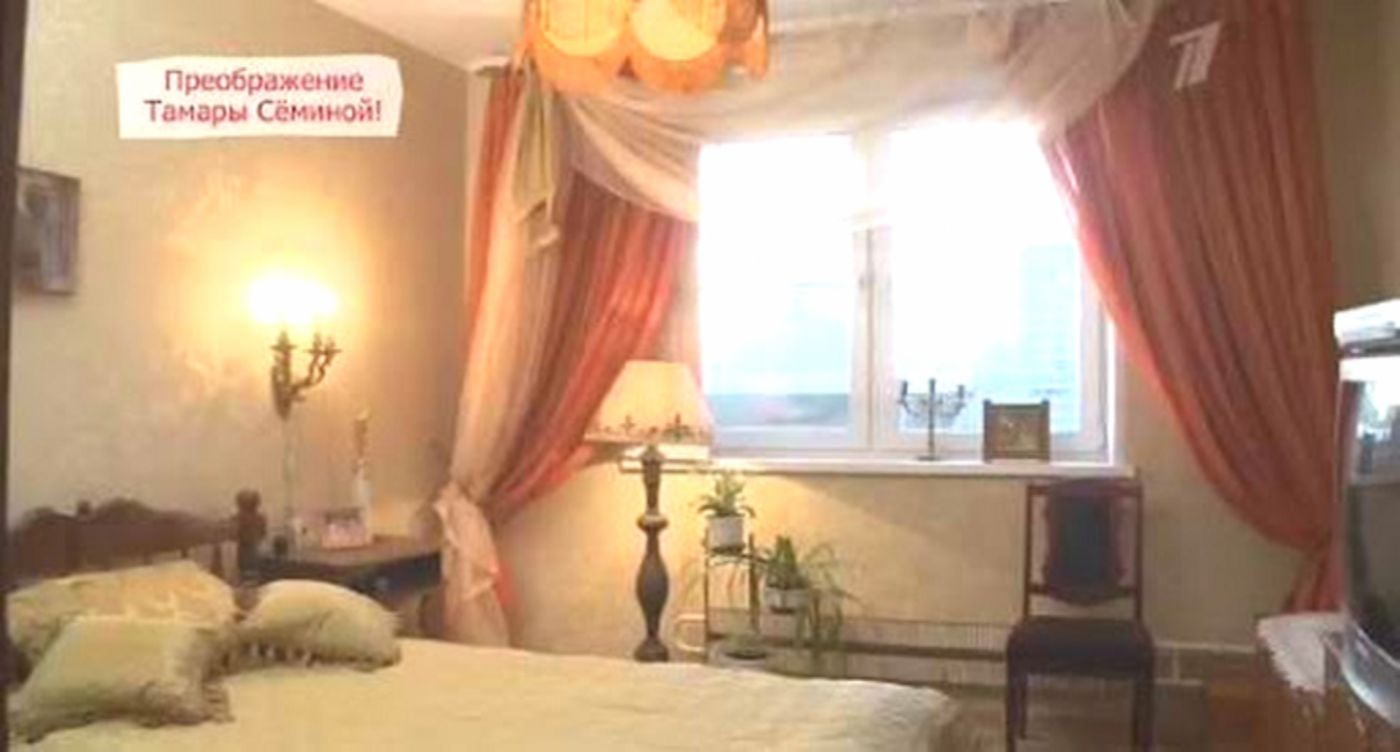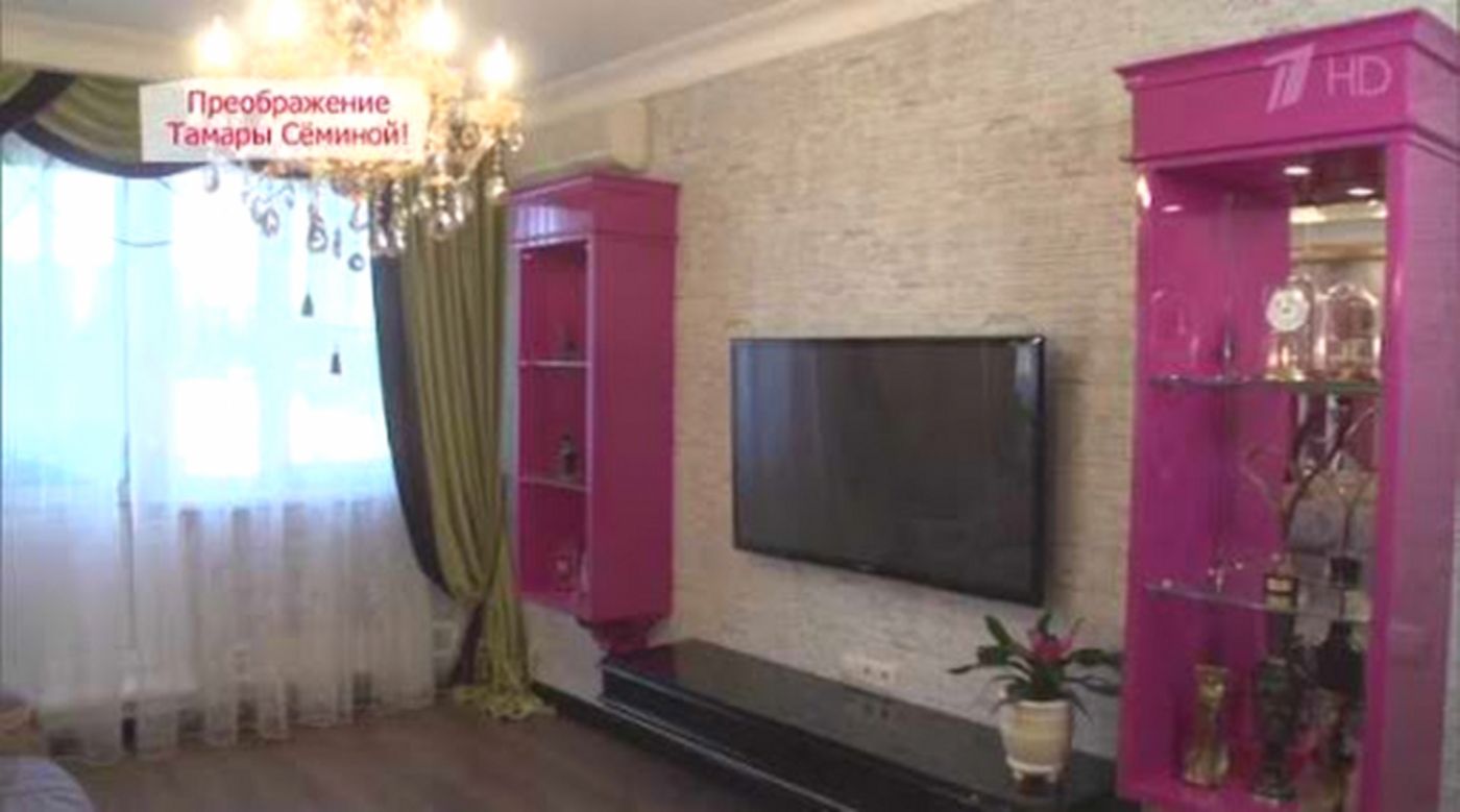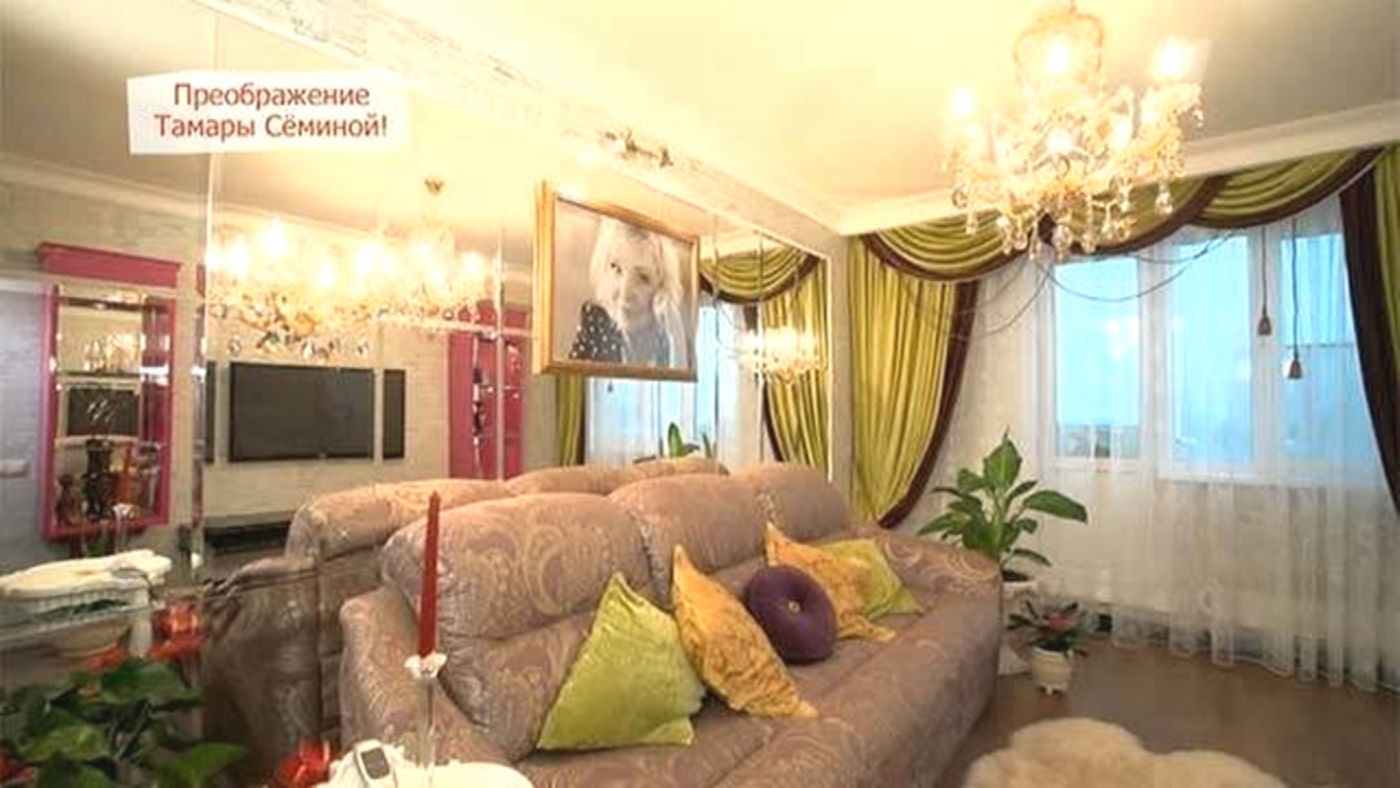 В центре комнаты появился удобный диван с выдвижной подставкой для ног, рядом — кофейный столик, на полу — мягкий меховой коврик. Завершила образ люстра с хрустальными подвесками. Напротив дивана повесили большой телевизор, чтобы хозяйка могла пересматривать любимые фильмы. Над диваном разместили портрет самой Тамары Петровны в новой золотистой раме, а уют добавили живые растения.