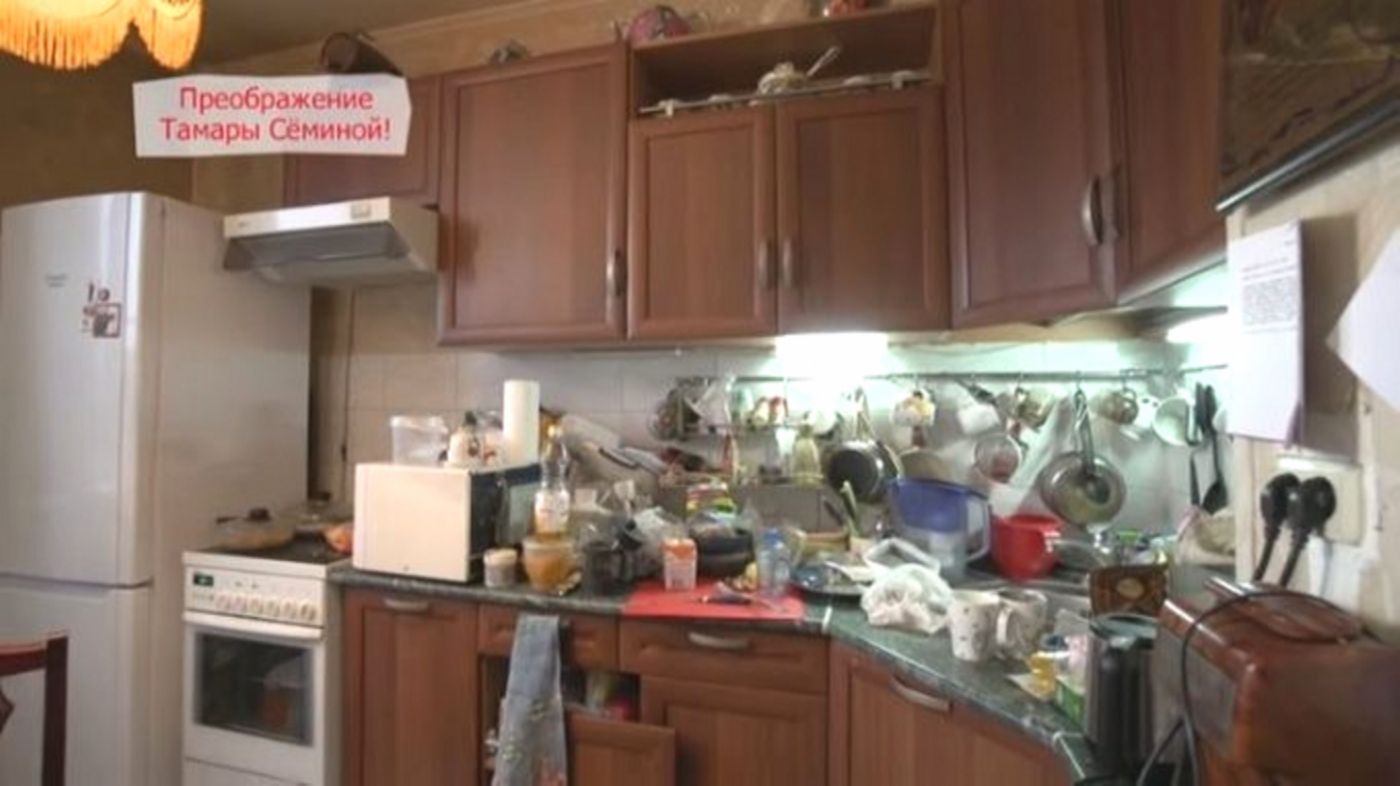Кухню решили не переделывать, а просто тщательно отмыть. Клининговая команда привела в порядок пол, стены и мебель, а люстру и занавески позаимствовали из спальни. У актрисы обнаружилась внушительная коллекция гжельского фарфора — после чистки она стала настоящим украшением интерьера.