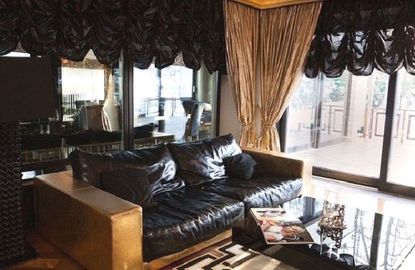 Мебель тоже подобрана тщательно — кожа, бархат, дорогой текстиль. За телевизором висит стена из резного чёрного дерева. Это, кстати, такой себе центр притяжения в гостиной. Хотя, судя по фотографиям, они больше общаются между собой, чем смотрят телик.​