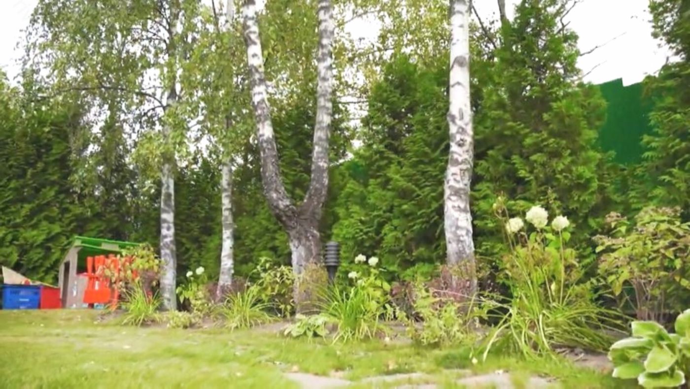 Участок вокруг дома невелик, но ухожен: аккуратный газон, несколько берёз и туй, оставшихся от прежних владельцев, создают атмосферу уединённости без ощущения замкнутости.