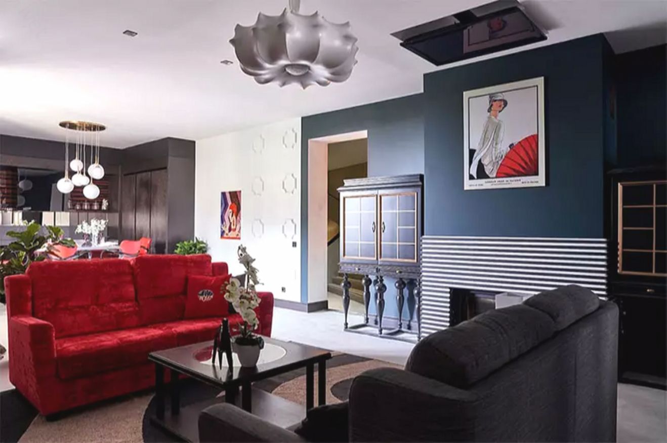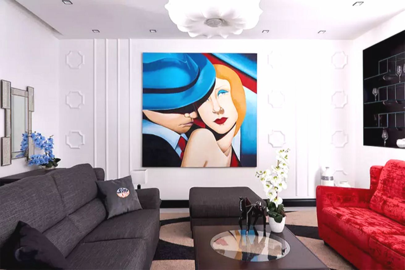 Центральным элементом гостиной стала квадратная картина с изображением самих фигуристов, обрамлённая молдингами. В комнате установлены два дивана — серый и ярко-красный, что придаёт обстановке живость. Белые стены соседствуют с акцентной тёмно-синей, а потолок выполнен в виде лаконичного натяжного полотна.