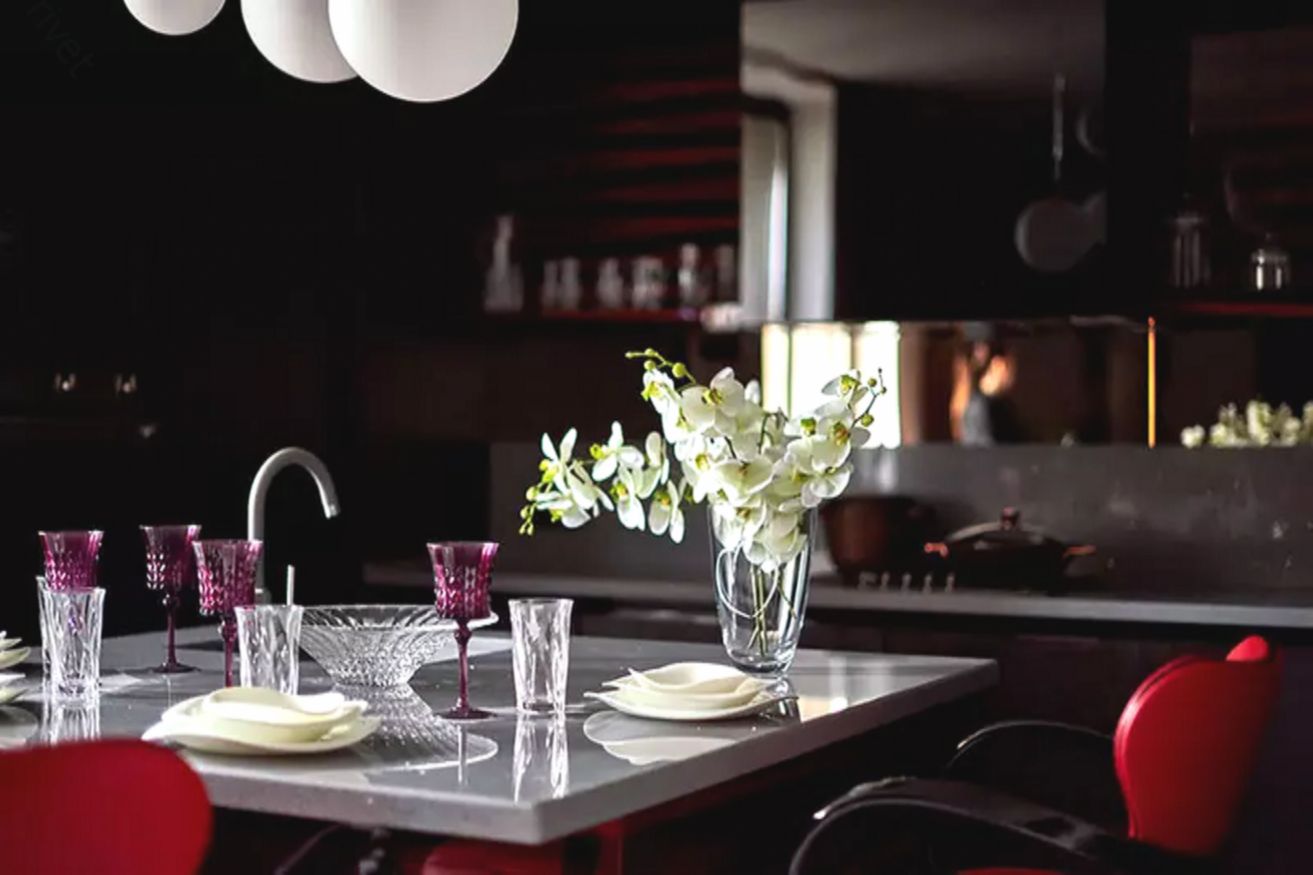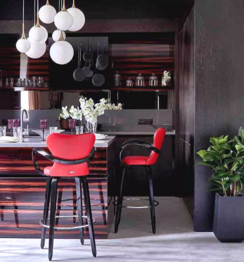 Семья часто ужинает именно здесь. Для удобства детей выбрали барные стулья с подлокотниками, чтобы они могли безопасно сидеть за высоким островом.