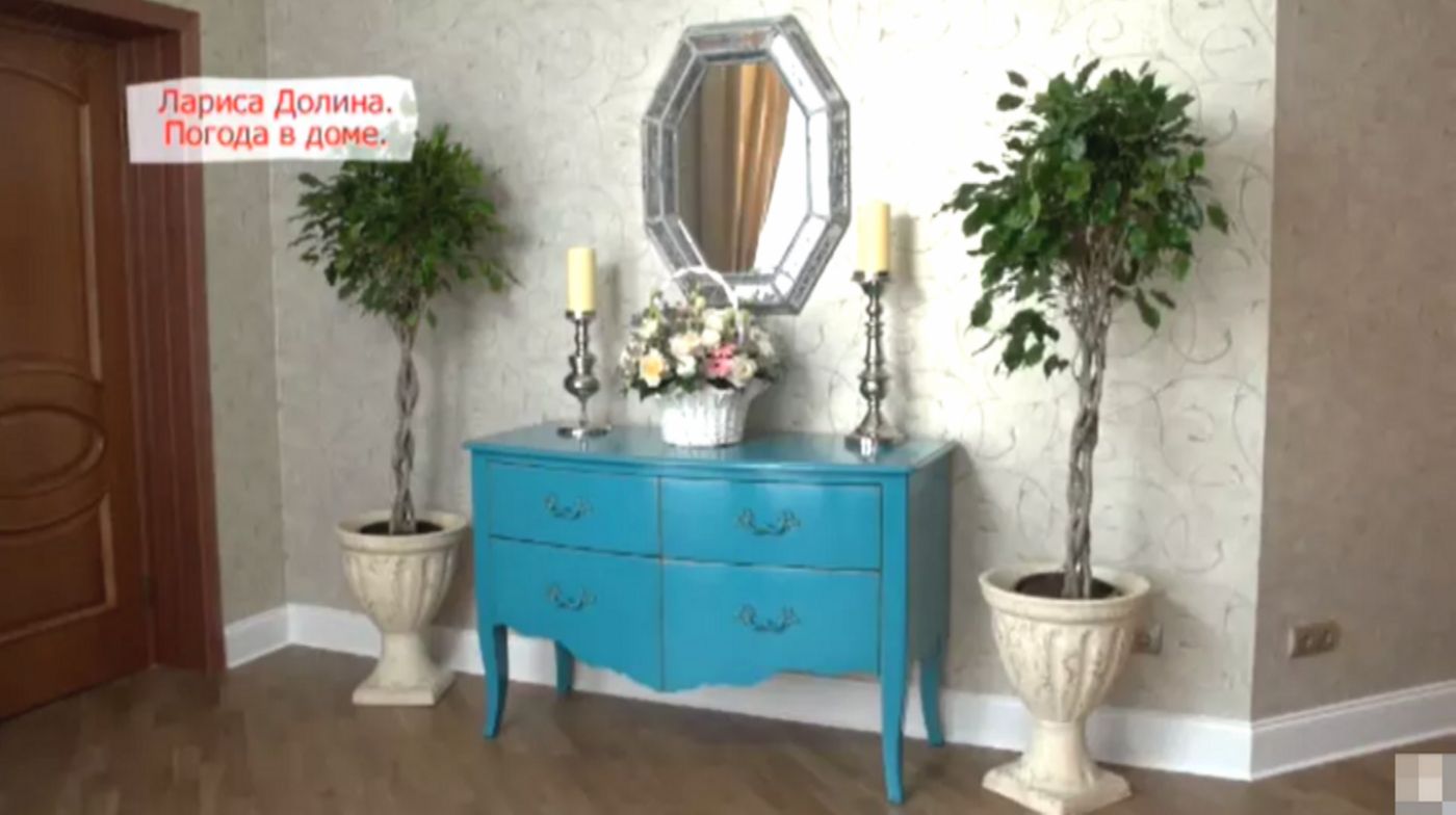 Получилась зона, где хочется сесть с книжкой или чашкой кофе. Светлая мебель мягких форм, витражные двери в модерне — ну прям как из старого голливудского фильма. И монограммы буквы LD (Лариса Долина) повсюду: на паркете, на фарфоре. Лариса потом хвалила — говорит, теперь там уютно, как в песне «Погода в доме». А вы бы рискнули с такой персонализацией?​ По-моему, перебор.