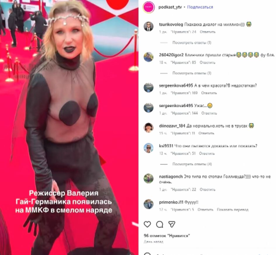 На фоне этого паноптикума Валерия Гай Германика чувствует себя как рыба в воде. Режиссер выбрала «голый» наряд, где две накладки на соски героически держали оборону против здравого смысла. Это уже даже не вызов устоям. Это скучный, предсказуемый эпатаж, который в 2026 году вызывает лишь зевоту и желание отправить автора в колхоз, убирать то самое золото, которым она так щедро себя украсила.