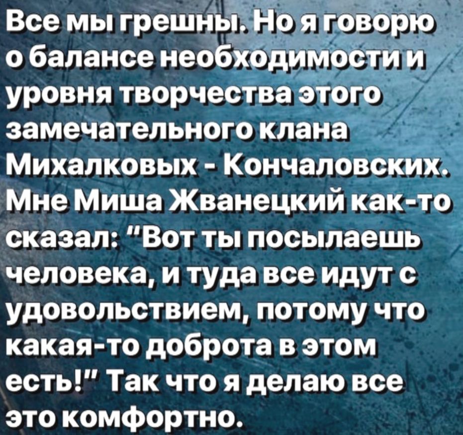 Его особенно задевало, как Михалков обращается с историей: перекраивает факты, подгоняет их под идеальную картинку, где нет места сомнениям и сложной этике. По мнению Александра Анатольевича, настоящее искусство обязано провоцировать, выворачивать душу, а не предлагать готовые ответы, упакованные в красивые кадры.