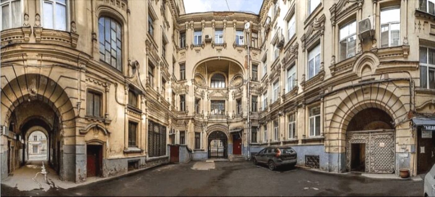 Если пройти через арку со стороны Большого Гнездниковского переулка, можно оказаться в типичном для центральной Москвы дворике, где многие годы протекала повседневная жизнь знаменитого актёра. Из-за плотной городской застройки здесь не так много зелени, а пространство выглядит довольно строго и по-московски сдержанно. Небольшая детская площадка и несколько кустарников — вот почти всё, что можно увидеть в этом уголке.