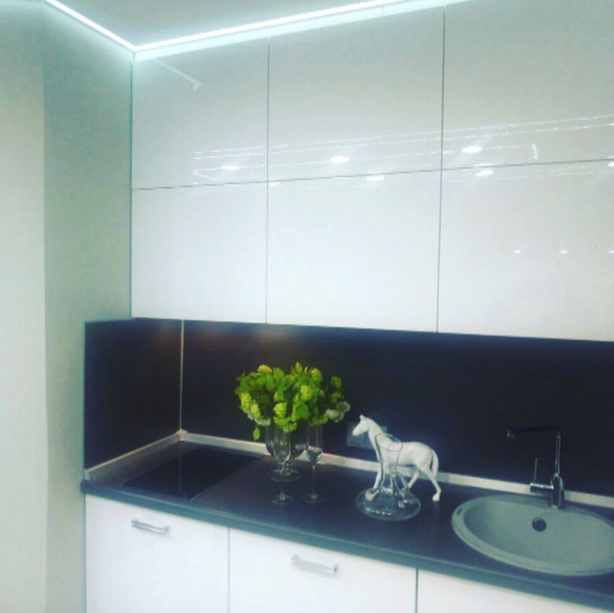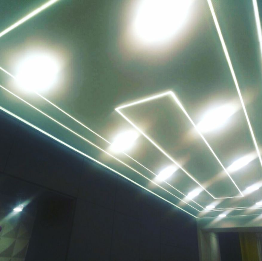 Отдельная гордость проекта — потолок. Он натяжной, со сложной системой подсветки. Освещение можно менять в зависимости от настроения.