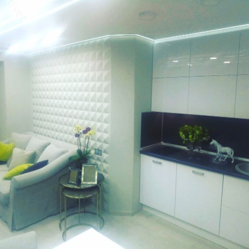 В оформлении сделали ставку на минимализм. Потолок и большинство стен оставили белыми. На отдельных участках появились обои с геометрическим рисунком. За диваном разместили объёмные гипсовые панели — они создают интересную игру света и перекликаются с фасадами кухни.