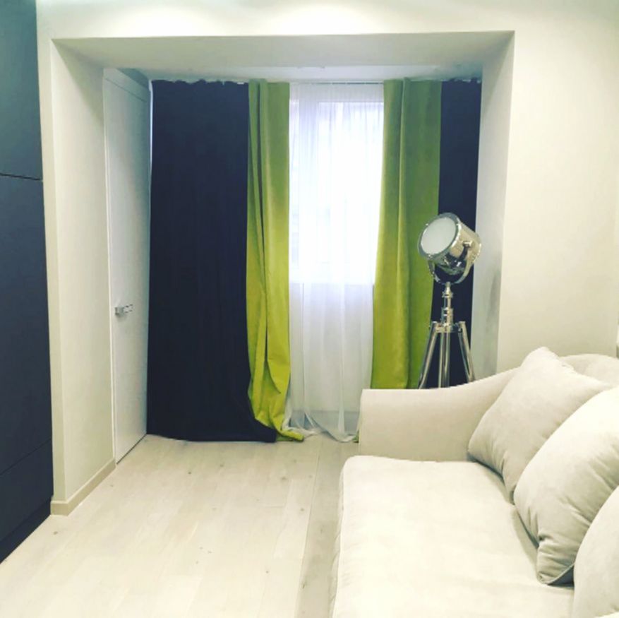 Яркость решили добавить за счёт текстиля. На окнах — плотные шторы блэкаут в фиолетово-салатовой гамме. Причём они двусторонние: если хозяйке надоест насыщенный цвет, можно перевесить их серой стороной.