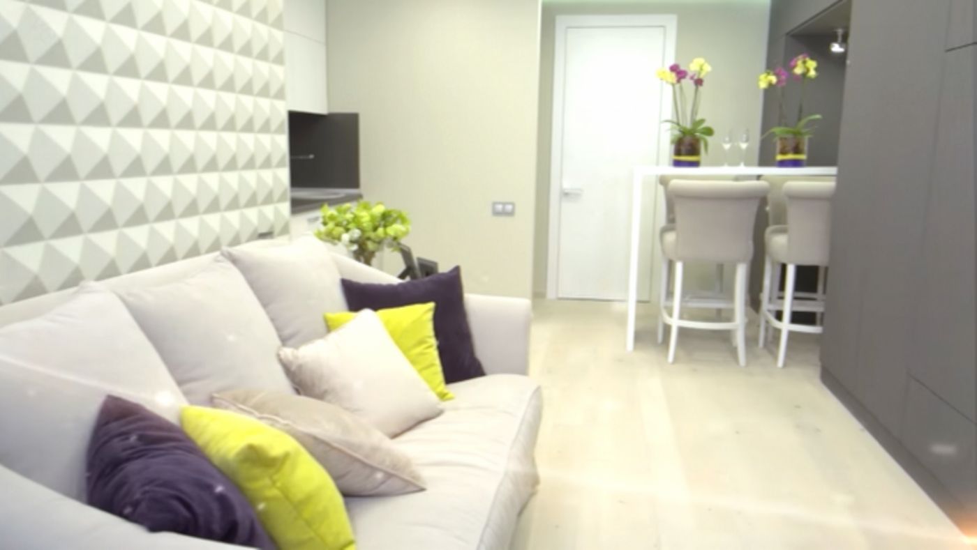 Мебель выбрали спокойную. Светлый диван в классическом стиле не раскладывается, зато украшен множеством подушек. Рядом — аккуратные металлические столики. Барная стойка со стульями стала центром всей композиции.