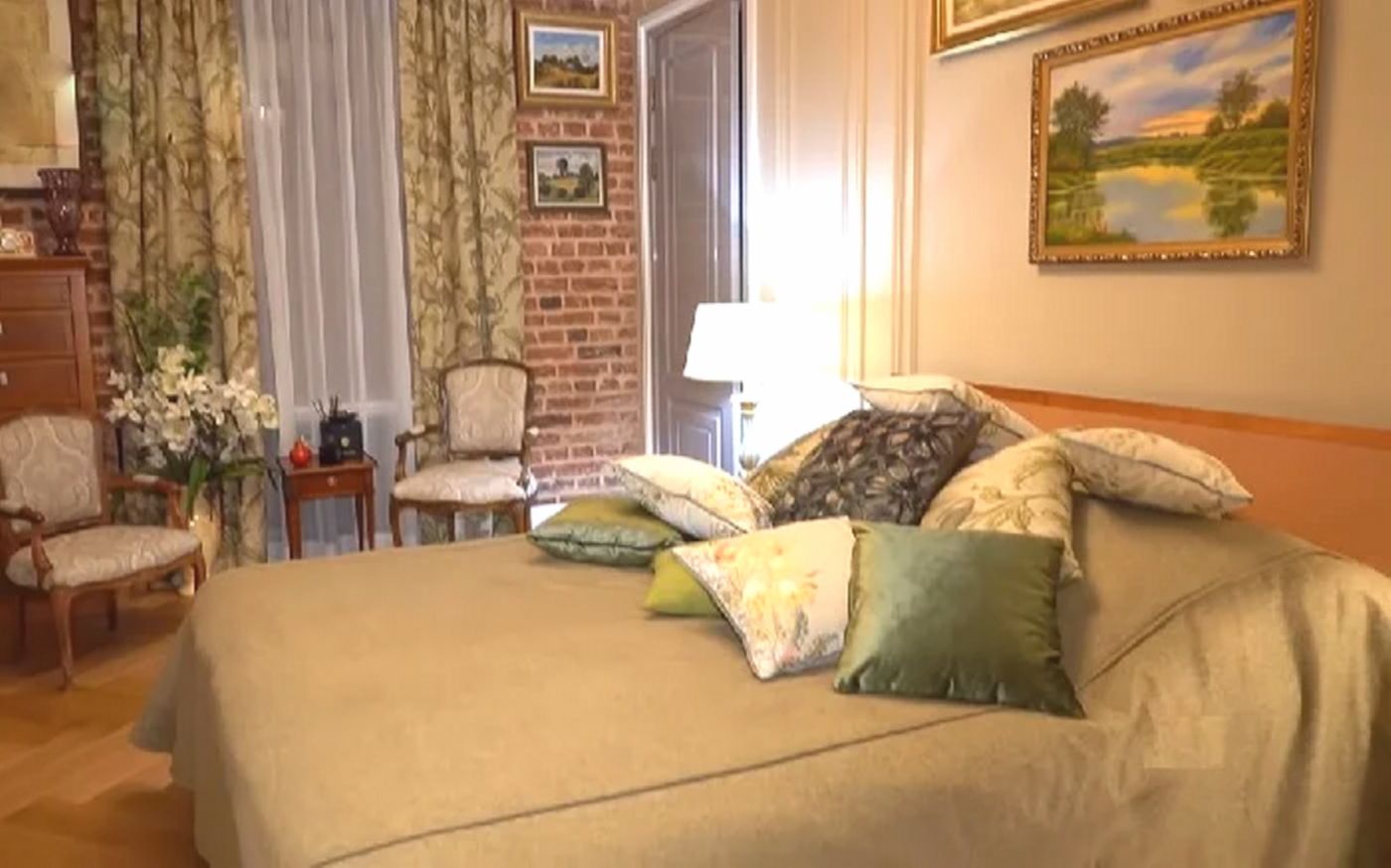 Спальная комната оформлена в более тёмных и глубоких тонах — дизайнеры подчёркивают, что спальня должна успокаивать. На стенах — множество картин, которые создают атмосферу домашнего тепла.