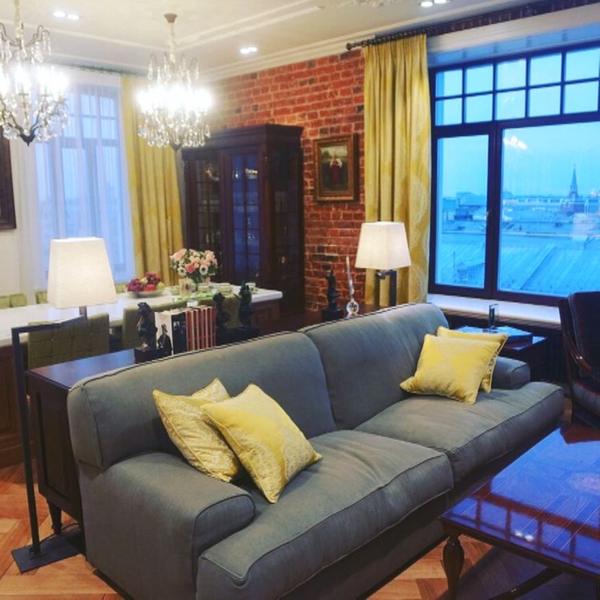 Даниил, который живёт прямо этажом выше, настоял на капитальном ремонте: перестроили часть стен, заменили отделку, обновили мебель, добавили систему «Умный дом». Поскольку особяк старинный, кирпичную кладку решили оставить — сейчас этот стиль с индустриальными нотками снова в моде.