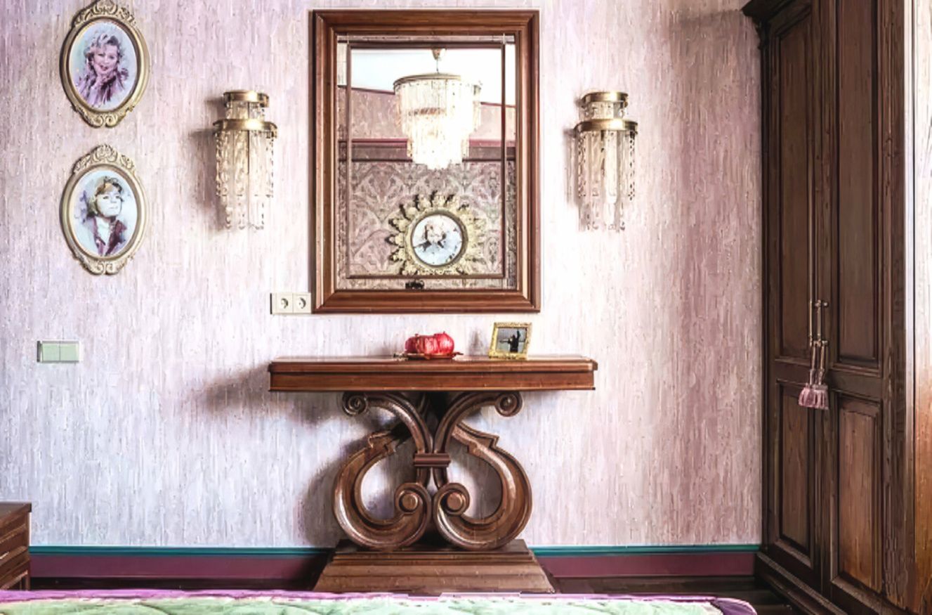 Мебель изготовлена по индивидуальным проектам — кровать и кресло выполнены из массива дерева и отличаются изяществом форм. Завершают интерьер дизайнерское зеркало, аккуратная консоль и тумбы, созданные на заказ. Всё вместе выглядит не вычурно, а спокойно и благородно — именно так, как любит сама хозяйка.