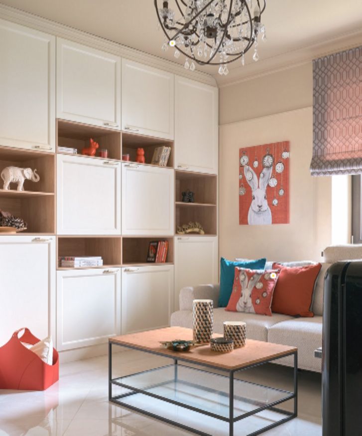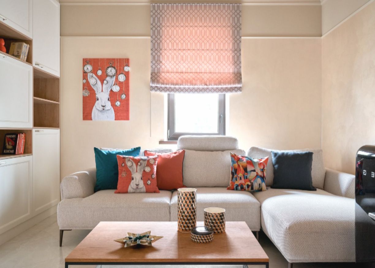 Декор добавляли точечно — например, яркие часы, подушки в тон и постер с белым кроликом, который нашли в интернете и напечатали специально под нужный размер.