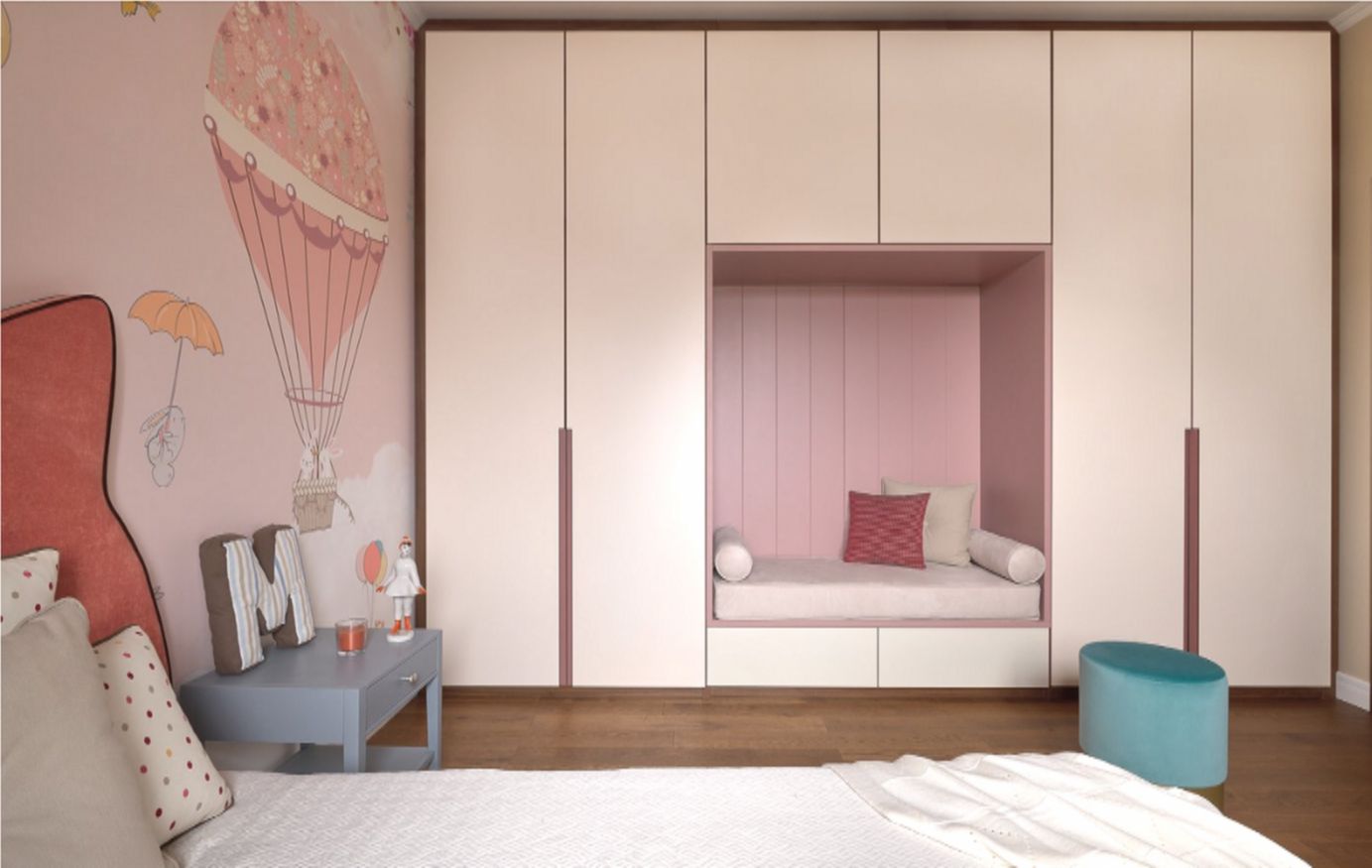 Мебель разноцветная: кровать с обивкой лососевого оттенка, голубые кресло и пуф. Хранение продумали особенно тщательно — шкаф сделали по индивидуальным эскизам, а в центре конструкции предусмотрели уютную лежанку, где можно читать или просто отдыхать.