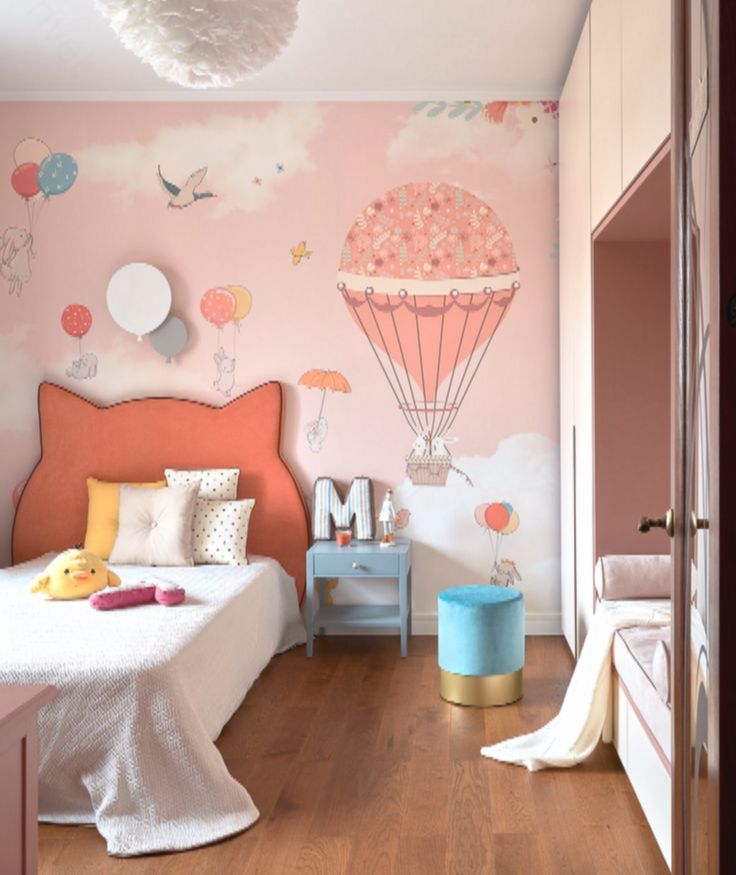 Для акцентной стены выбрали обои с милыми зверюшками и воздушными шарами. Эту тему поддержали бра над кроватью в форме шаров.