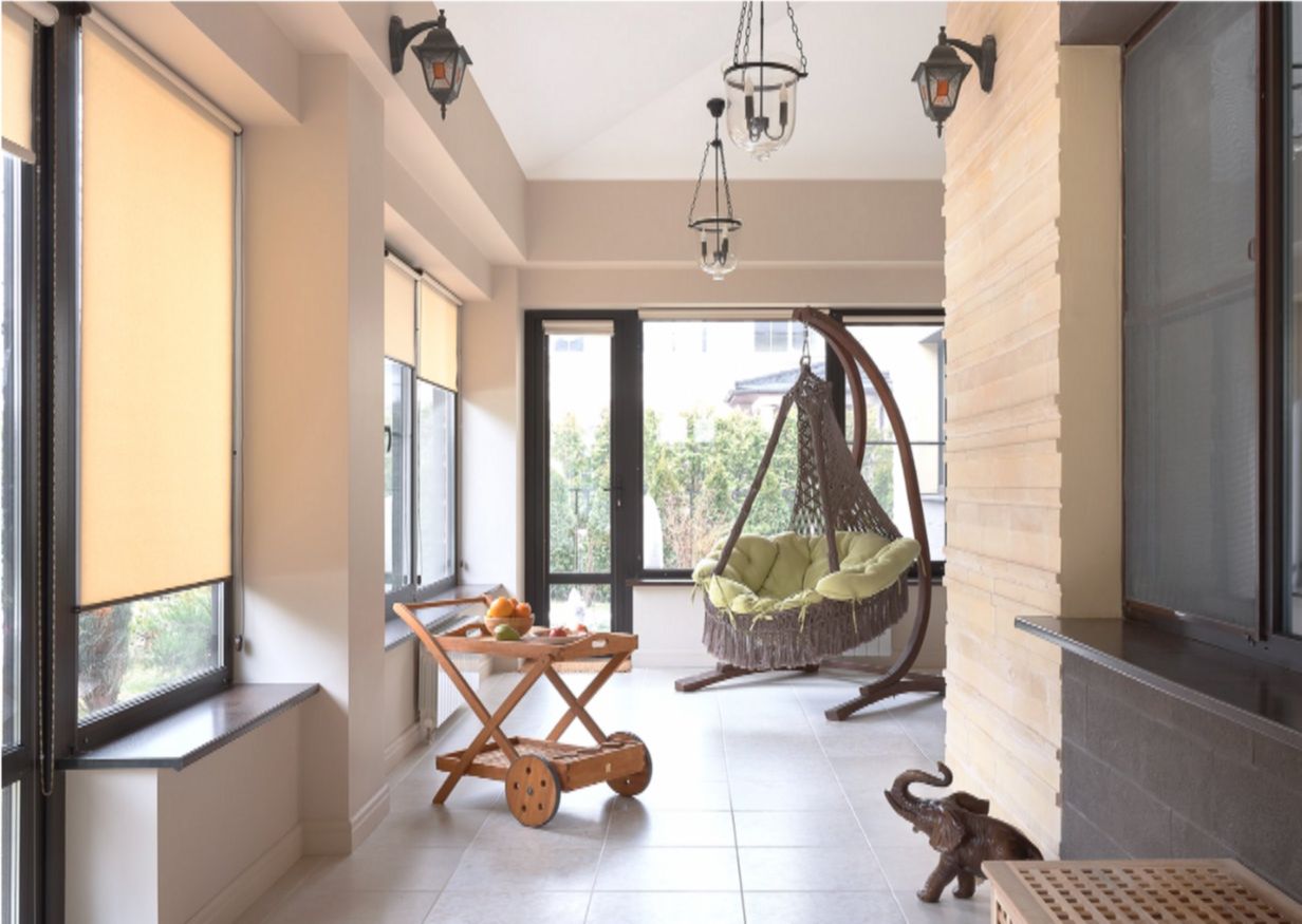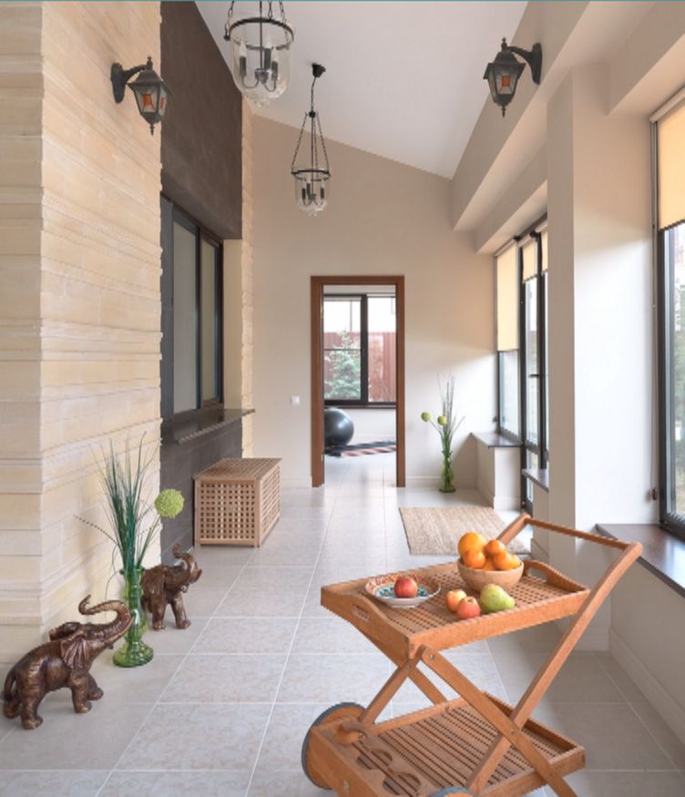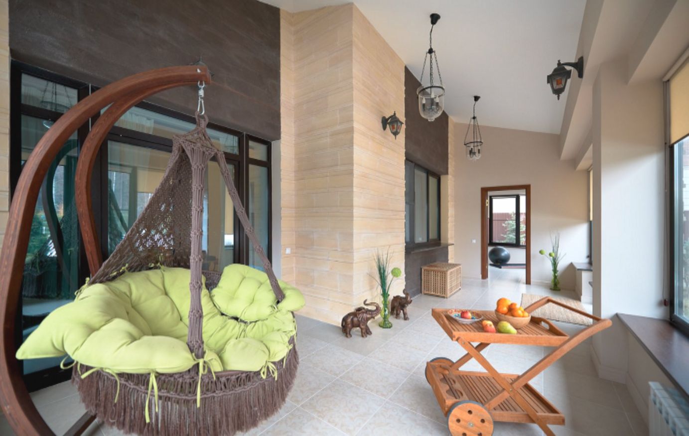 Задняя веранда раньше была открытой и почти не использовалась. Её утеплили, застеклили и превратили в зону отдыха с небольшим тренажёрным залом. На полу — керамогранит, стены окрашены износостойкой краской. Минимум мебели, немного декора — и получилось место, где приятно расслабиться после тренировок.