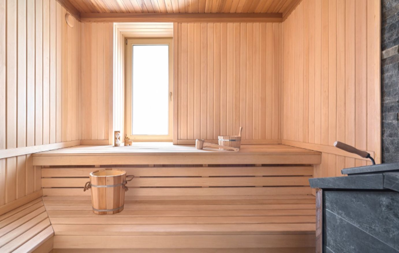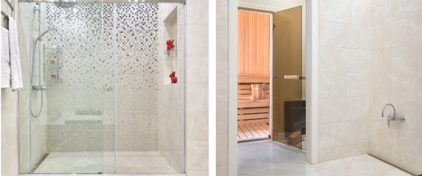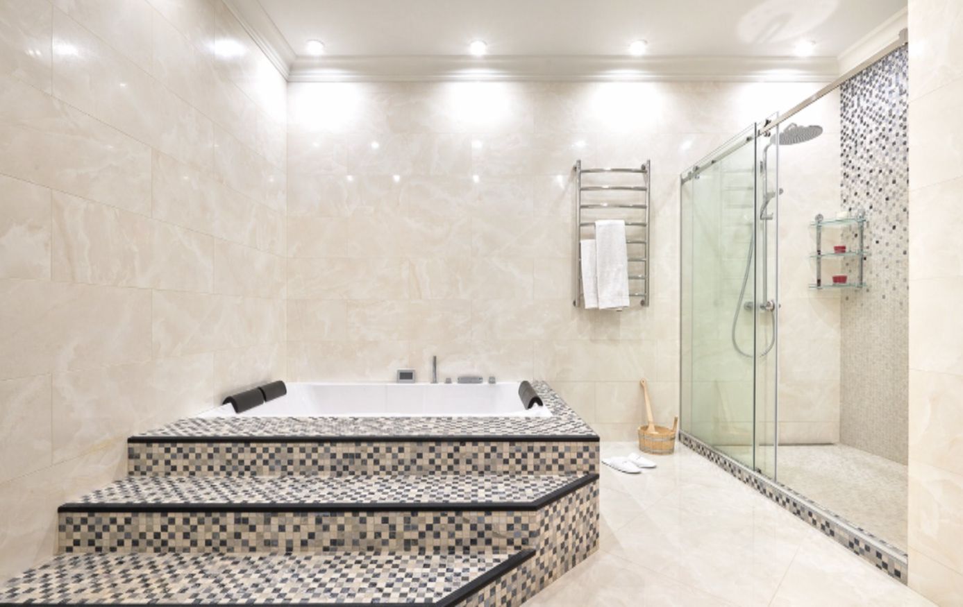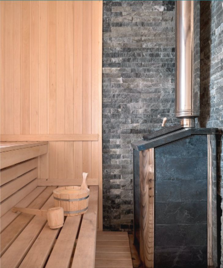 А вот гараж в итоге решили переоборудовать полностью. Максим предложил сделать там настоящую русскую баню, а заодно комнату отдыха и просторную душевую с джакузи. Общая площадь — около 50 квадратных метров. В отделке использовали кедр и натуральный камень, в душевой — мозаику и керамогранит.